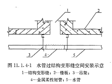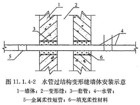 水管穿越变形缝空间或墙体时,依据GB50242-2002《建筑给水排水及采暖工程施工质量验收规范》,>设置柔性连接,>一般多>采用金属柔性短管。