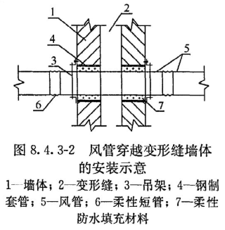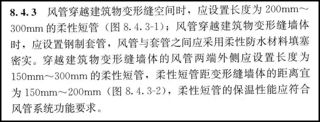 风管穿越变形缝空间或墙体时,依据>GB50738-2011《通风与空调工程施工规范》,应设置柔性短管: